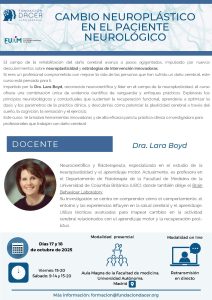 La Fundación DACER y la FUAM organizan el curso «Cambio Neuroplástico en el Paciente Neurológico» los días 17 y 18 de octubre de 2025. Impartido por la Dra. Lara Boyd, neurocientífica experta en neuroplasticidad , el curso, con modalidades presencial y online , busca mejorar la rehabilitación del daño cerebral mediante el análisis de principios neurobiológicos y estrategias innovadoras. La inscripción tiene un costo de 150€, con un precio reducido de 120€ antes del 30 de junio.